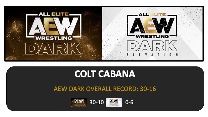 AEW Dark #54 2020 September 29 Colt Cabana & John Silver vs. The Natural Nightmares (Dustin Rhodes & QT Marshall) (6:32) AEW Dark #52 2020 September 15 Colt Cabana vs. QT Marshall (7:02) AEW Dark #50 2020 September 4 Colt Cabana vs. Zack Clayton (4:21) AEW Dark #47 2020 August 18 The Dark Order (Alex Reynolds & John Silver) & Colt Cabana vs. D3, Faboo Andre & Ryzin (4:10) AEW Dark #35 2020 May 26 Colt Cabana vs. Lee Johnson (3:49) AEW Dark #33 2020 May 12 Colt Cabana vs. Shawn Dean (4:54) AEW Dark #32 2020 May 5 Colt Cabana vs. Kip Sabian (10:45) AEW Dark #26 2020 March 24 Colt Cabana vs. Brandon Cutler (4:31) AEW Dark #25 2020 March 17 Colt Cabana vs. Peter Avalon (5:41)VIDEO