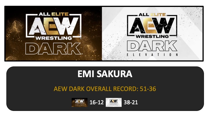AEW Dark: Elevation #84 2022 October 10 Emi Sakura vs. Trish Adora (3:10) AEW Dark #162 2022 September 20 Emi Sakura vs. Avery Breaux (3:15) AEW Dark #161 2022 September 13 Diamante & Emi Sakura vs. Queen Aminata & Skye Blue (4:01)VIDEO